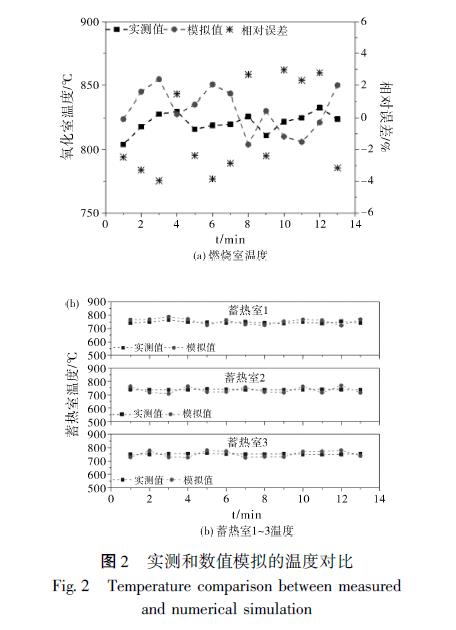在連續(xù)監(jiān)測(cè)穩(wěn)定運(yùn)行階段多個(gè)切換周期后, 將燃燒室三個(gè)熱電偶及變送器監(jiān)測(cè)的爐膛溫度值計(jì)算得到平均值, 同時(shí)將每個(gè)蓄熱室中的出口位置熱電偶的溫度值進(jìn)行記錄, 圖2 為同一測(cè)點(diǎn)的工程實(shí)際數(shù)據(jù)與數(shù)值模擬值的對(duì)比。通過對(duì)比, 得到溫度模擬數(shù)據(jù)與實(shí)際監(jiān)測(cè)值的相對(duì)誤差均在4% 以內(nèi), 這也可能
