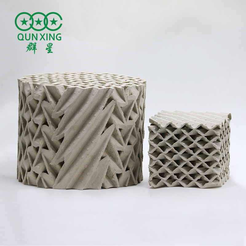 在精餾裝置上被廣泛應用。它具有以下特點: 1.填料上端和下端的通道垂直設置,并與凸條 硫酸裝置中干燥塔和吸收塔大多采用耐酸堿性 之間所形成的傾斜狀的通道圓滑過渡連接當液體 能良好的陶瓷填料。傳統(tǒng)的干吸塔基本上都采用散 流經(jīng)填料層本體時液體能垂直地從上到下進行流
